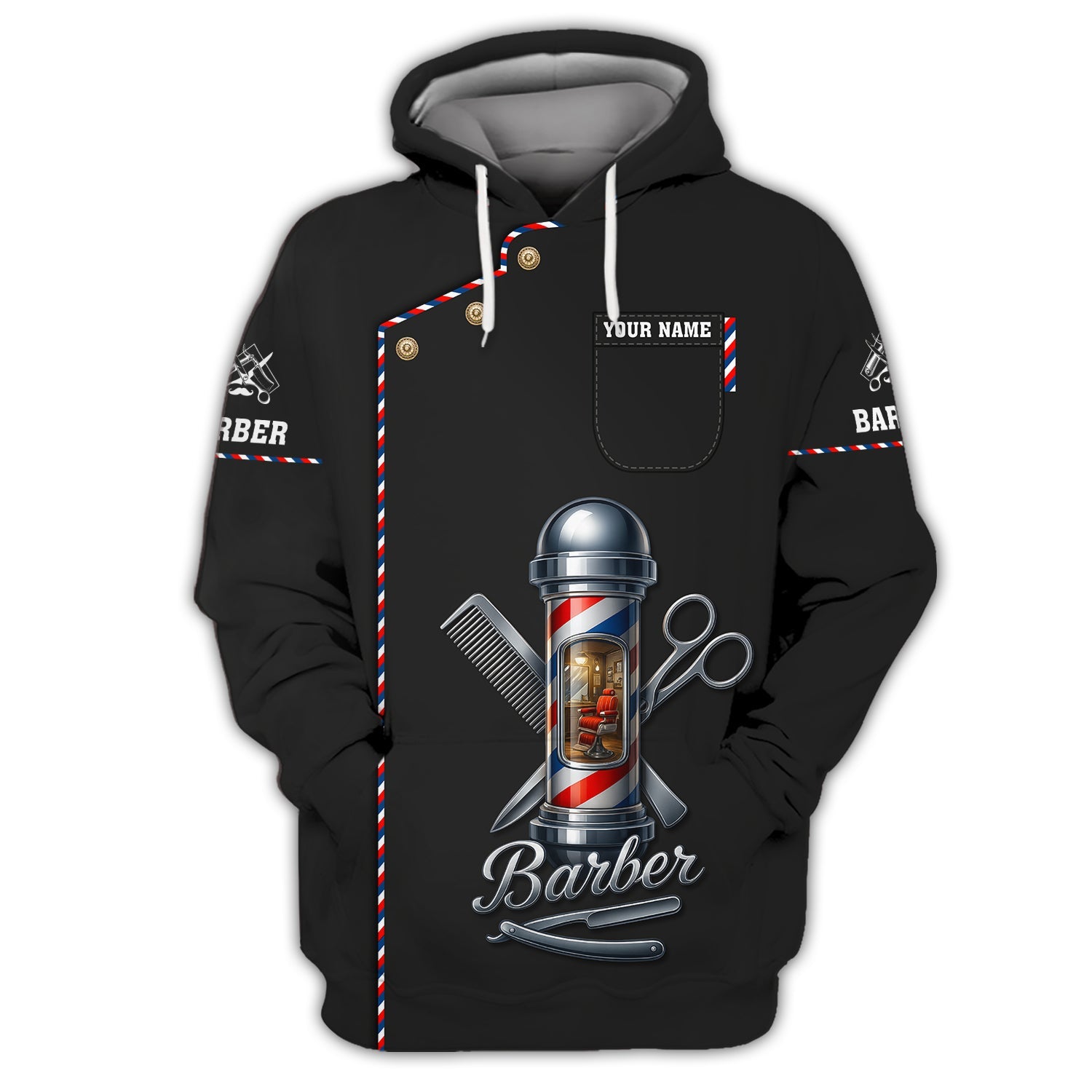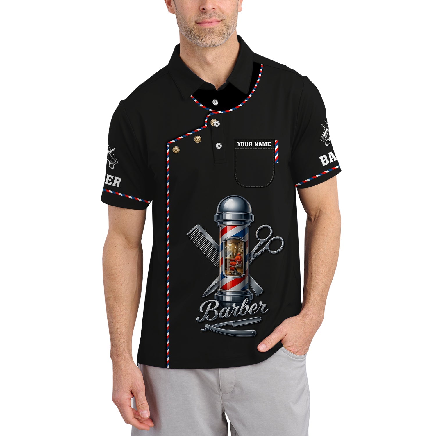- Are you a passionate barber or looking for the perfect gift for someone in the barbering world? Our Barber-Themed AOP collection combines style, comfort, and creativity – perfect for long shop hours or casual outings that showcase your barber pride.