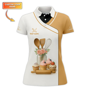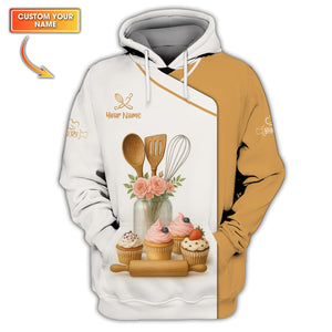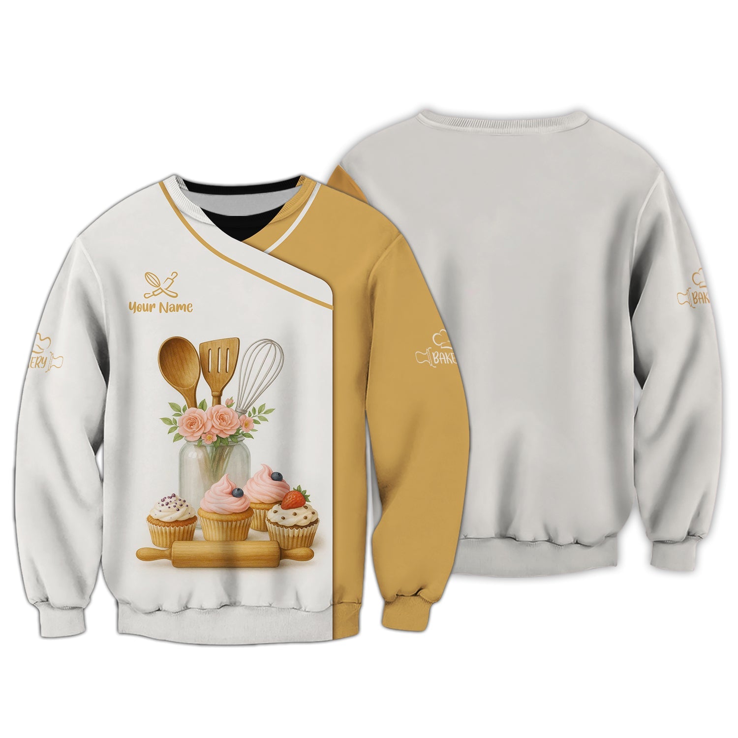 Custom Name Bakery Shirt, Cute Cupcake and Floral Kitchen Tools Baker Uniform