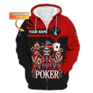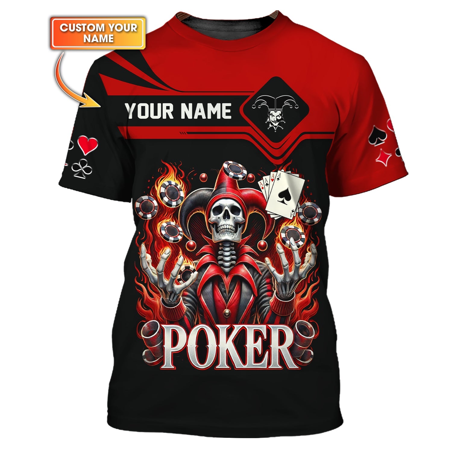Custom Poker T-Shirt – Fiery Joker Skull, Playing Cards & Poker Chips, Gift For Poker Players