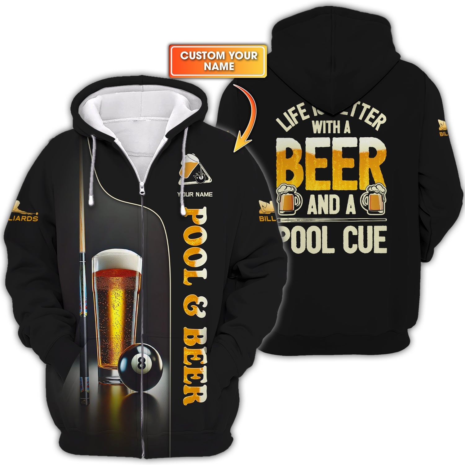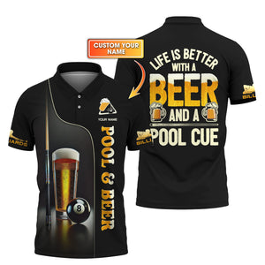 Custom Pool & Beer Shirt – Life Is Better With a Beer and Cue – Black Gold Billiards Tee
