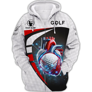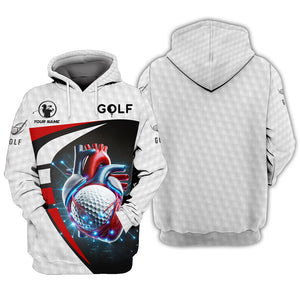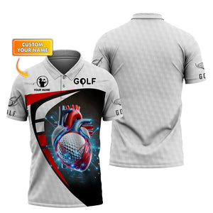 Custom White, Black & Red Golf Shirt – Anatomical Heart with Golf Ball Design – Bold Personalized Apparel for Passionate Golfers