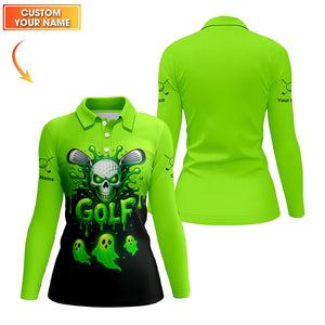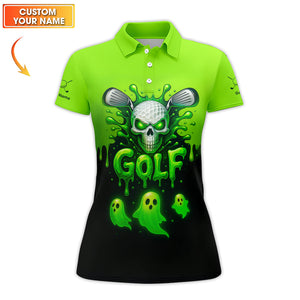 Halloween Golf Polos, Green Skull Golf Shirt For Men, Custom Name Golf Polo, Funny Golf Shirts For Golfers