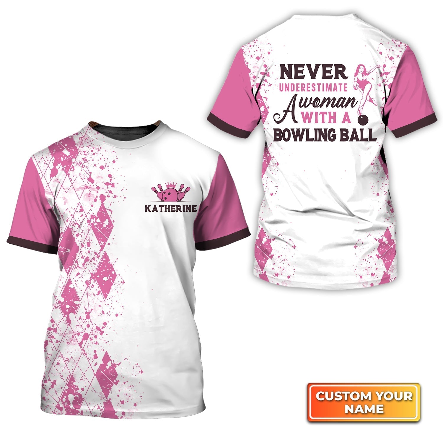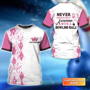 Never Underestimate a Woman with a Bowling Ball Pink Bowling Personalized Name 3D Tshirt