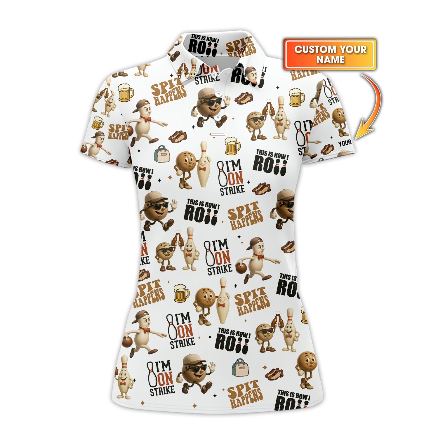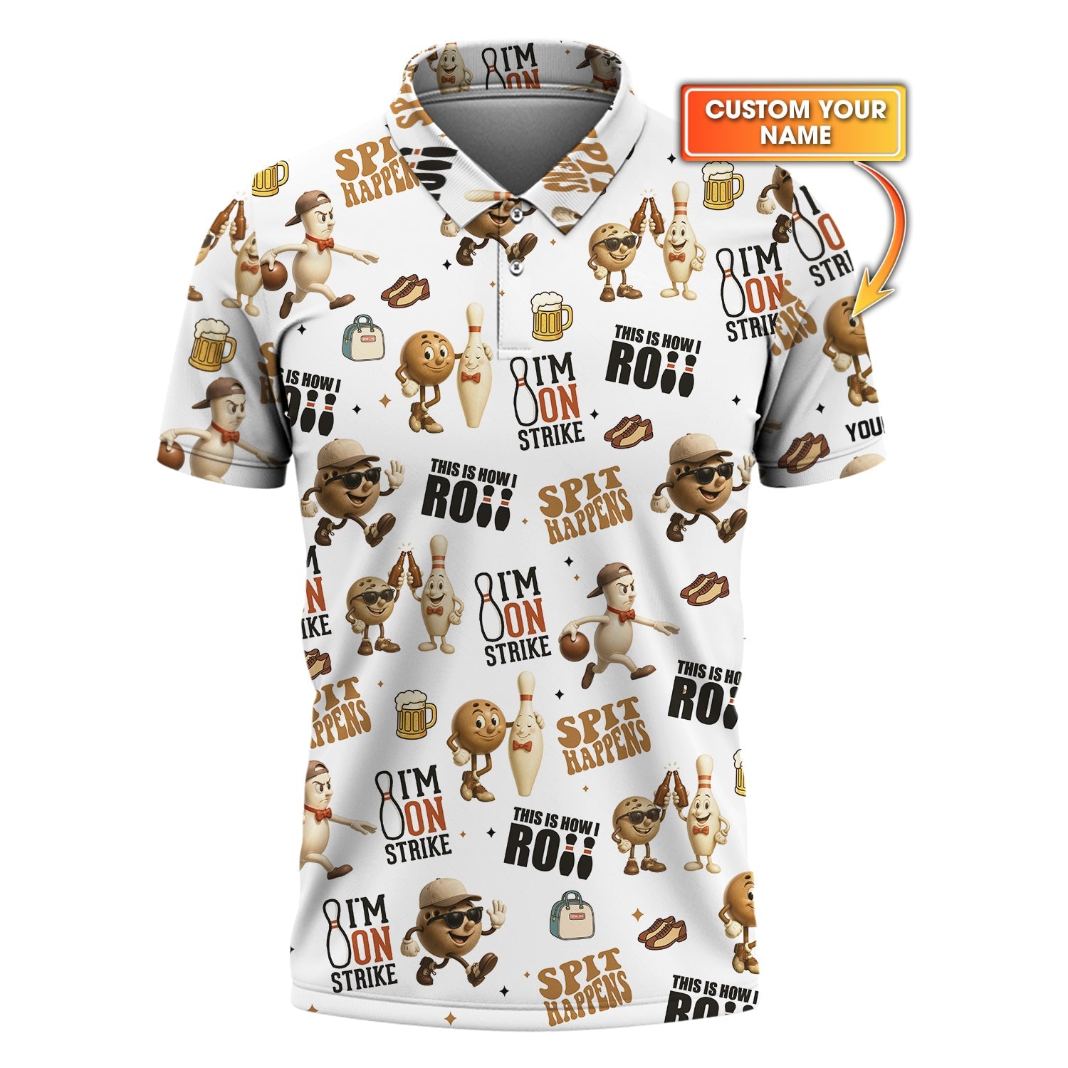 Roll into comfort and cool vibes with our all-over print bowling apparel, packed full of quirky, mini bowling pins, balls, lanes, and funny icons that bring the alley spirit wherever you go. Perfect for bowlers who like their style as sharp as their strikes!